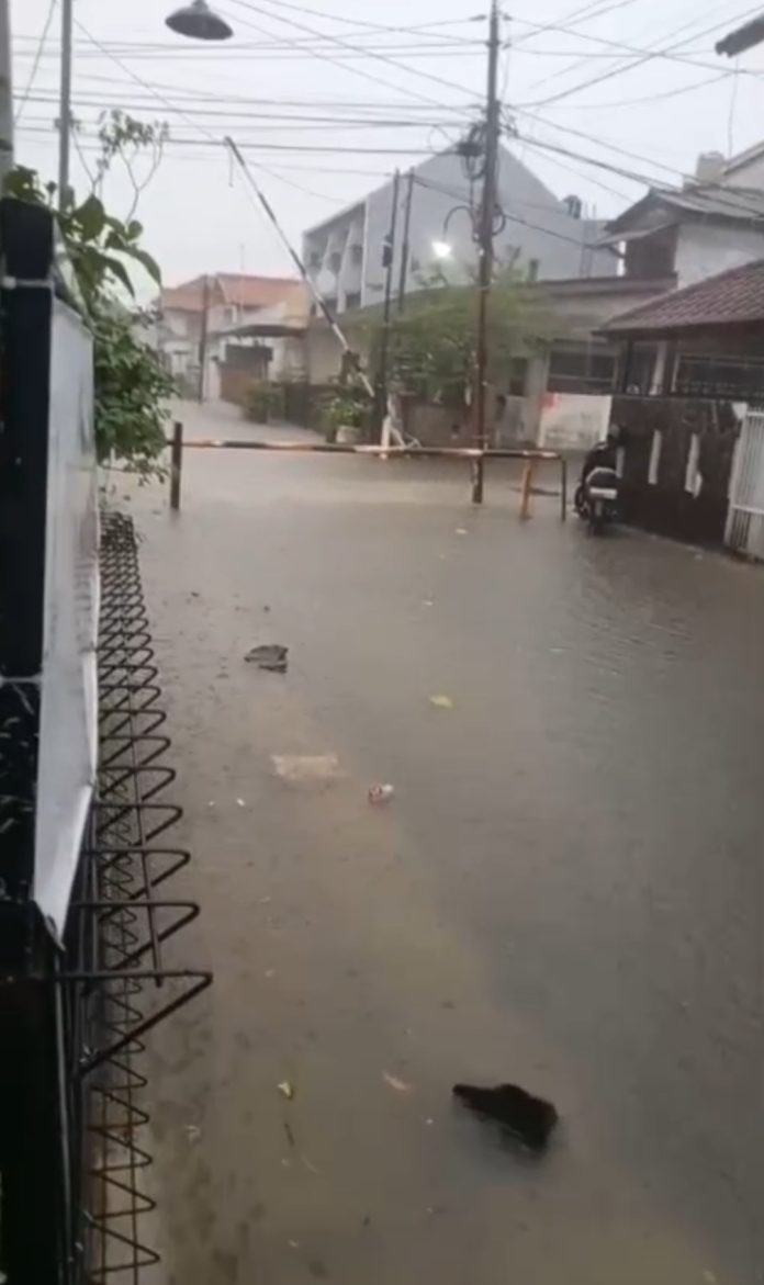 Pede- Baru saja 20 menit turun hujan, ruas jalan di perempatan Jl. Belimbing dan Nangka Raya, Kelurahan Depok Jaya, Kec Pancoran Mas Kota Depik sudah terendam banjir.